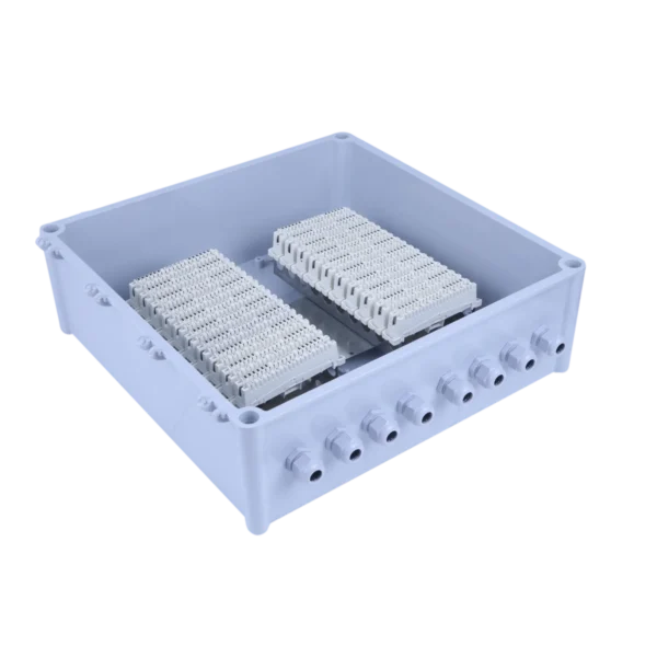 200 Pair Krone Module box & Telecom Distribution boxes waterproof IP65 and IP67. Elegant design with heavy duty ABS Enclosure for outdoor applications. Inbuilt krone module frames fitted with modules on it. Suitable PG Glands for cable inlet and outlets.