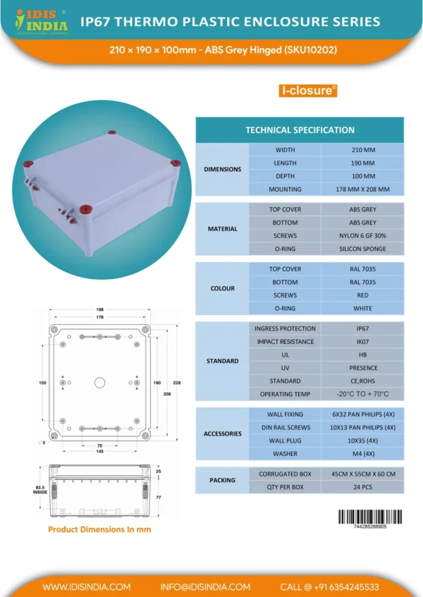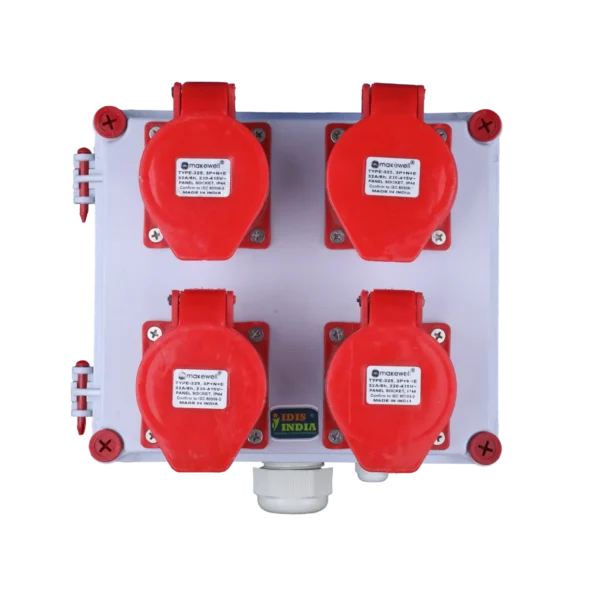 •Idis India’s ready made Industrial Distribution board with (4x) 32 Amp Three Phase Plug & Socket, IP67 ABS Enclosure 210 x 190 x 100 mm and complete internal wiring and terminals.