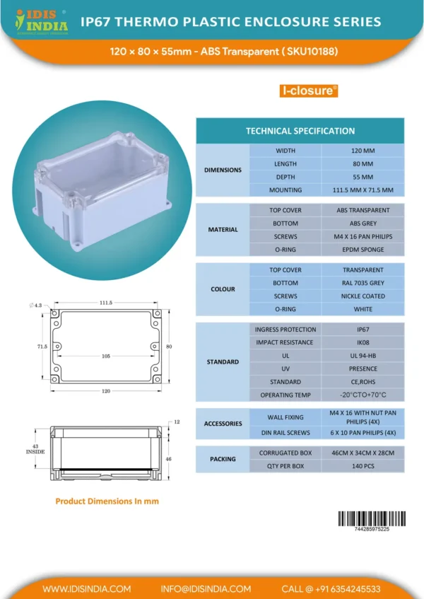 - IP65 Waterproof ABS Virgin Material from Direct manufacturer. Most running size 120 x 80 x 55 mm Transparent Enclosure.