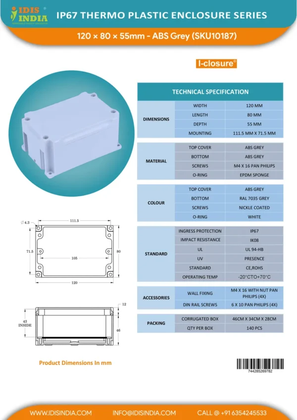Buy Electronics Enclosure 120x80x55mm for IOT , Automation Enclosures, Small Electrical devices, PCB’s, GPS Devices, GSM Devices and many more innovative products from Idis India