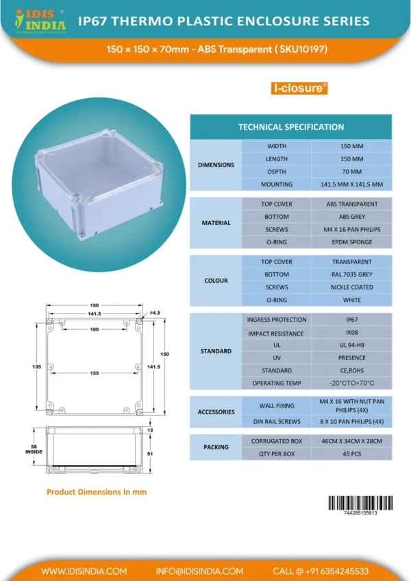 - IP65 Waterproof ABS Virgin Material from Direct manufacturer. Most running size 150 x 150 x 70 mm Transparent Enclosure.