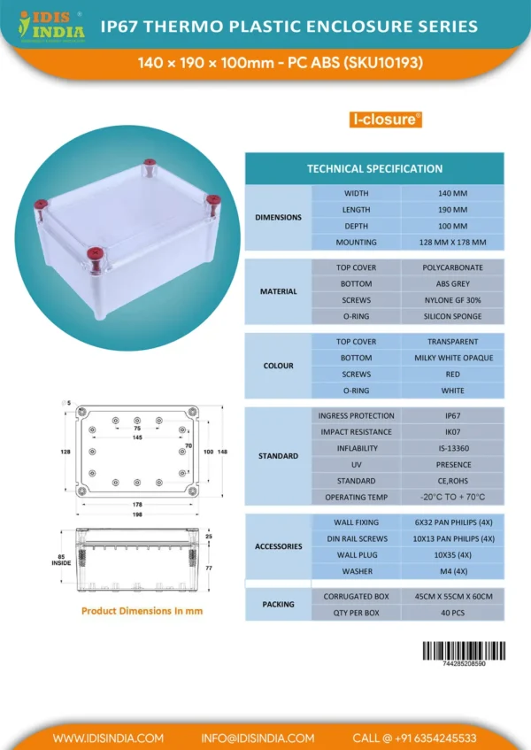 - Idis India’s PC ABS Transparent Enclosure 140 x 190 x 100 mm box waterproof IP65 IP67. Top cover is Polycarbonate Transparent and Bottom is ABS. Widely used for Solar ACDB and DCDB.