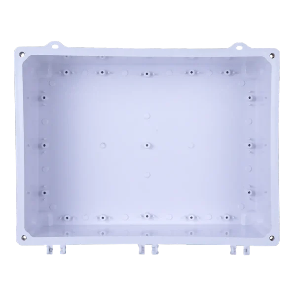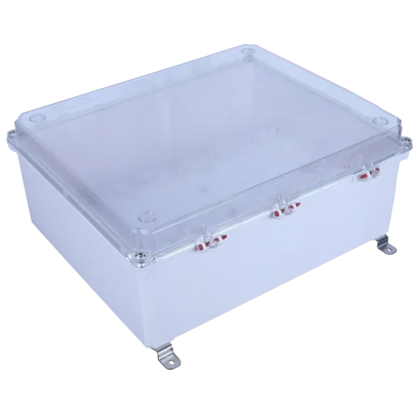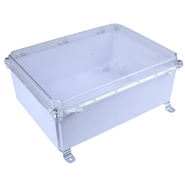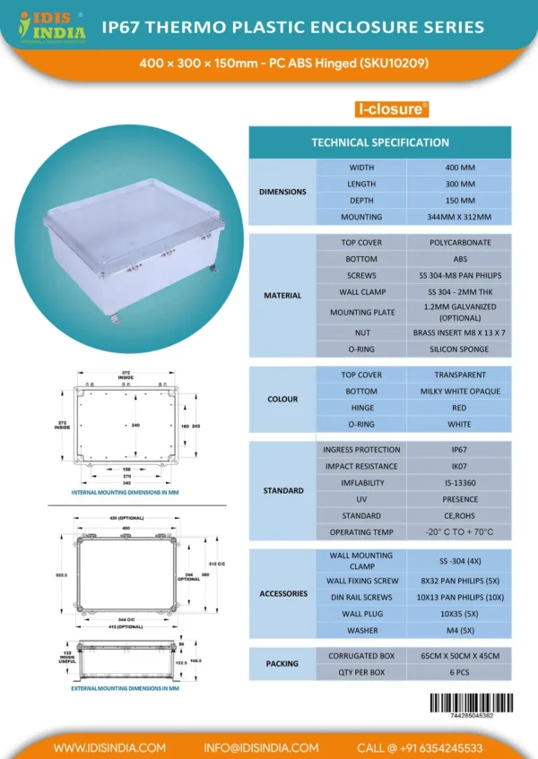 •Idis India’s PC ABS Enclosure 400 x 300 x 150 mm hinged box waterproof IP65 IP67. Polycarbonate Transparent top cover with White ABS Bottom.