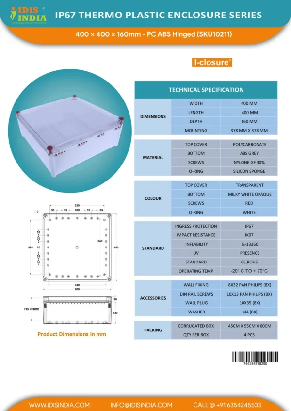 Buy PC ABS Enclosure 400X400X160 from direct manufacturer IDIS India Online at reasonable price and good quality. No dealer, no distributor. Supply from direct company.