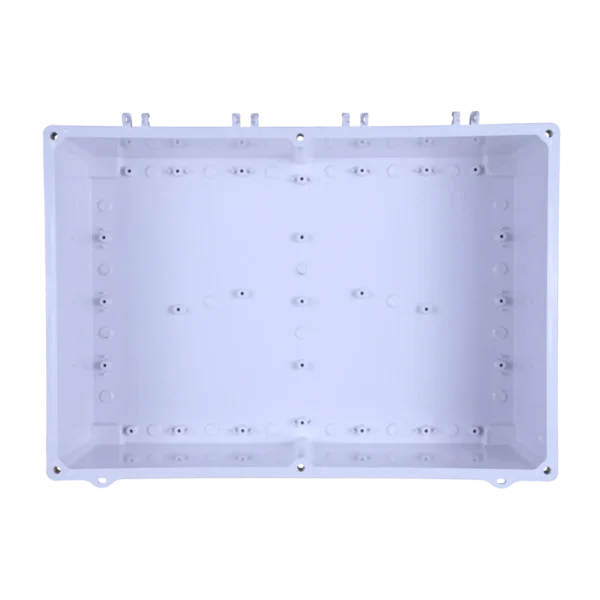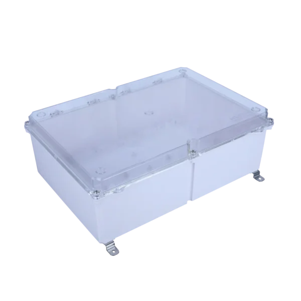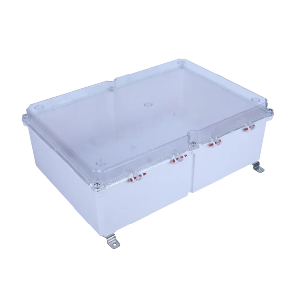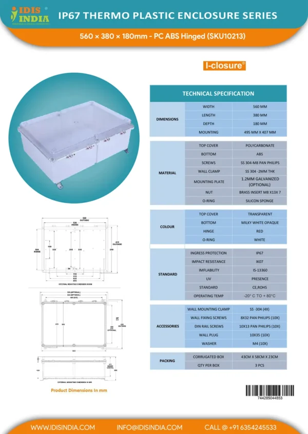 •Idis India’s PC ABS Enclosure 560 x 380 x 180 mm hinged box waterproof IP65 IP67. Polycarbonate Transparent top cover with White ABS Bottom.